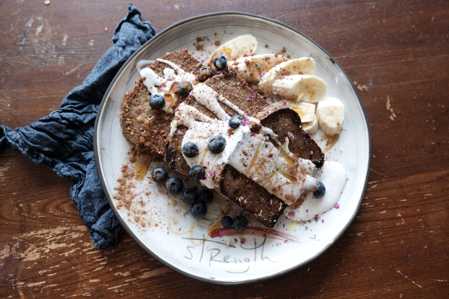 Pictured here my French toast is topped with Forager Project unsweetened cashew yogurt, a drizzle of VT maple syrup, cinnamon, blueberries, banana, and crushed rose petals.