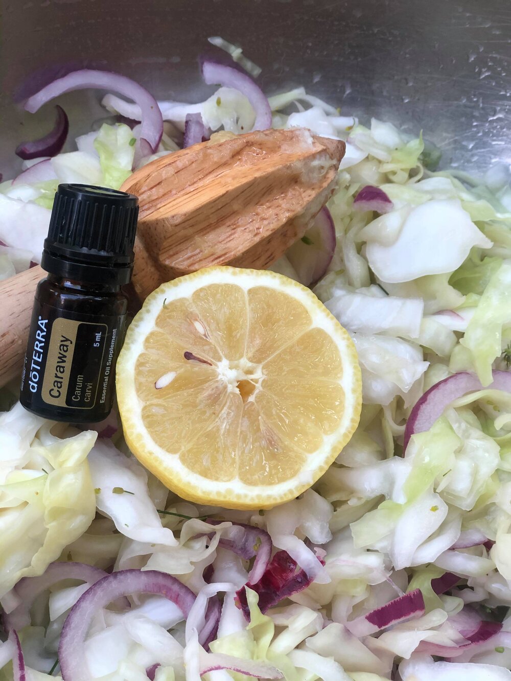 Add red onions, fennel, caraway, and lemon juice and continue massaging