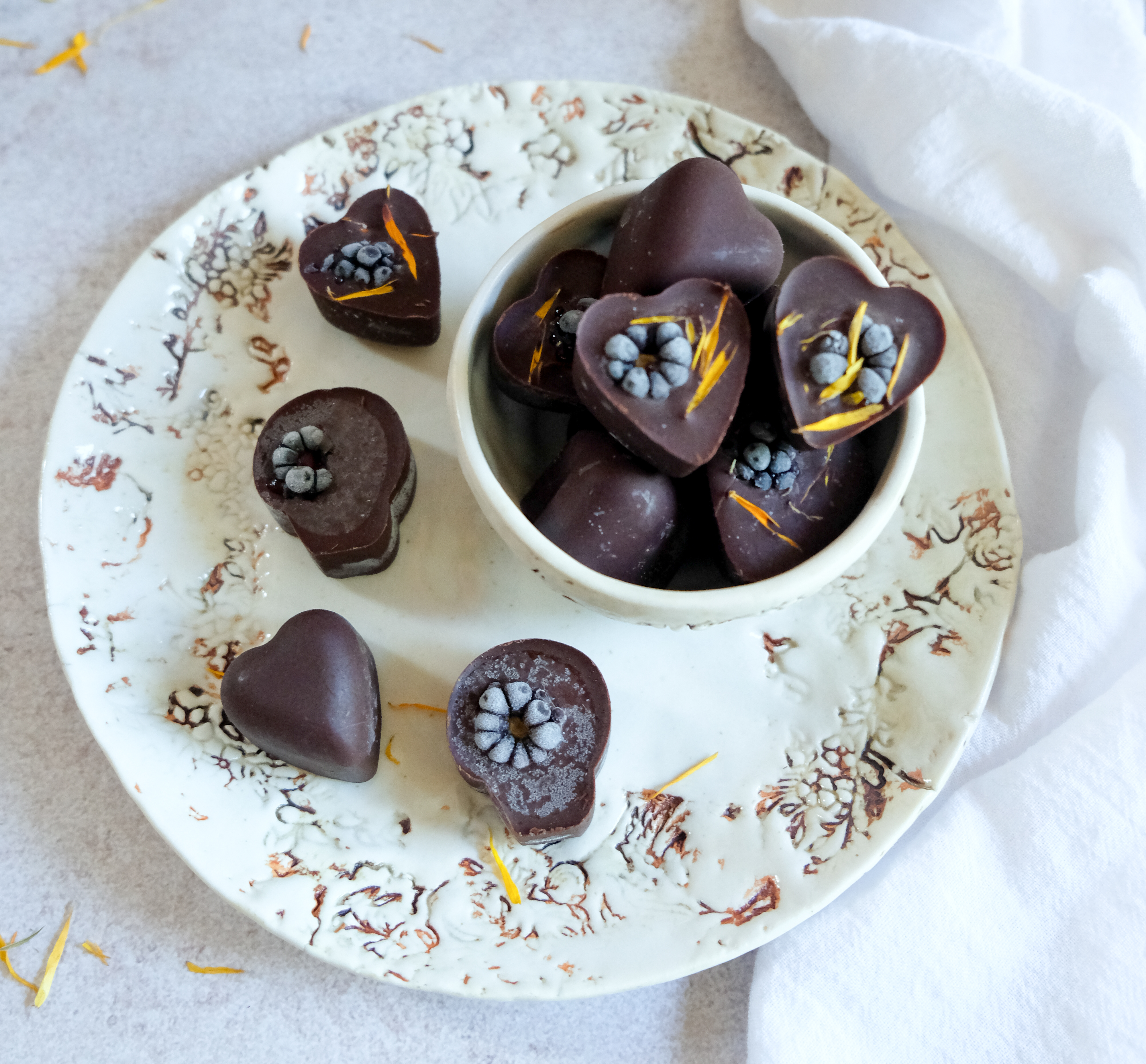 Drop 1/2 - 1 fresh berry in each chocolate. Sprinkle with calendula petals.